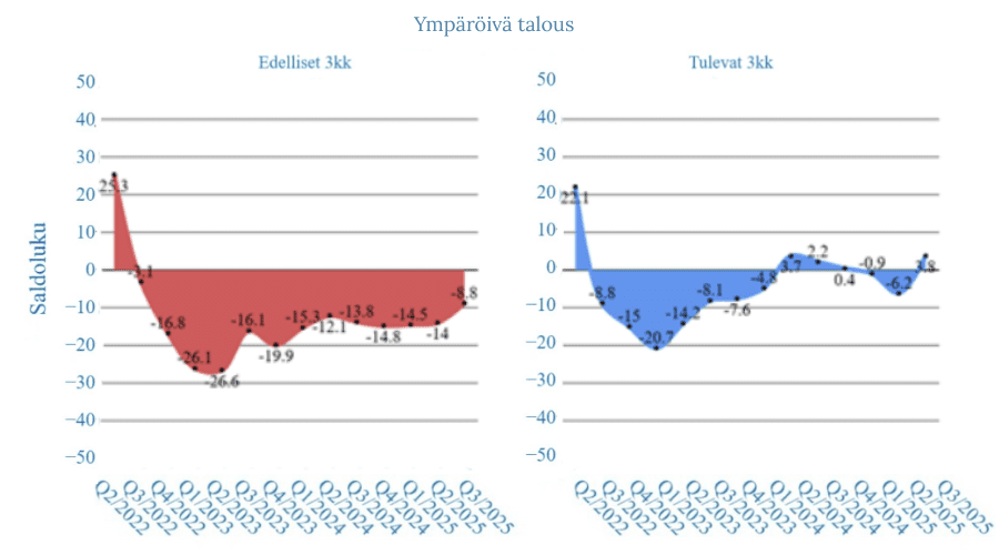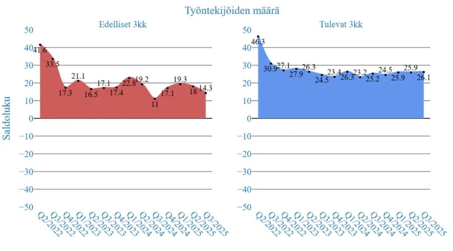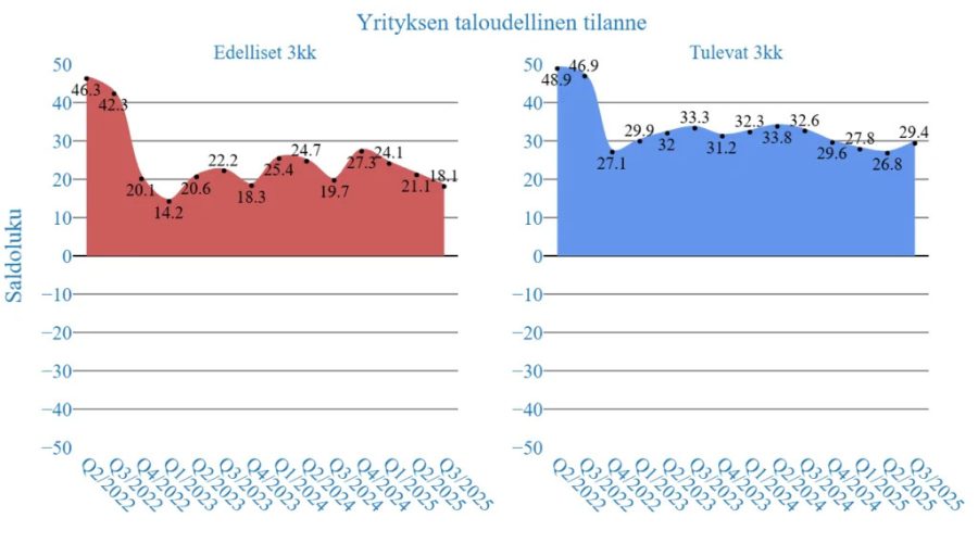 Yritysten arvio omasta taloudellisesta tilanteesta on edelleen selvästi positiivinen, vaikka taaksepäin katsova sentimentti hieman heikkeni (18,1 -> 21,1). Tulevaisuutta kuvaava indikaattori nousi kuitenkin 29,4:ään, mikä on ensimmäinen nousu yli vuoteen.